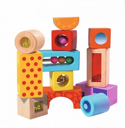 • Holzbausteine mit Sound – im Set sind 12 Klangbausteine in verschiedenen Farben und Formen enthalten; Die bunten Bausteine sind mit Kügelchen, Glöckchen, Quietscher und mehr ausgestattet und schulen die auditive Wahrnehmung der Kinder