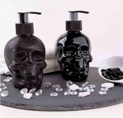 - Totenschädel Seifenspender schwarz mit Pumpverschluss für einfaches Reinigen der Hände, Maße 6,5 x 13 x 9,5 cm