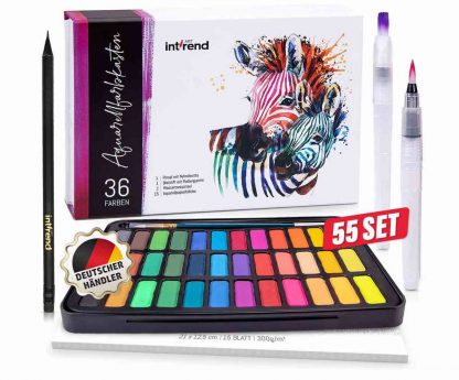 - WASSERFARBEN IN DURCHDACHTER VERPACKUNG: Das int!rend Aquarell Wasserfarben Set wird in einer stabilen Kartonverpackung geliefert, die alle Elemente des Aquarell Sets beinhaltet. Sowohl die Wassertankpinsel als auch das Aquarellpapier sind einzeln verpackt, die 36 Aquarellfarben finden in einer speziellen Metallbox Platz – die int!rend Verpackung ist durchdacht und alles ist an seinem Platz. Aber das Set eignet sich nicht nur für Anfänger sondern auch für Profis!