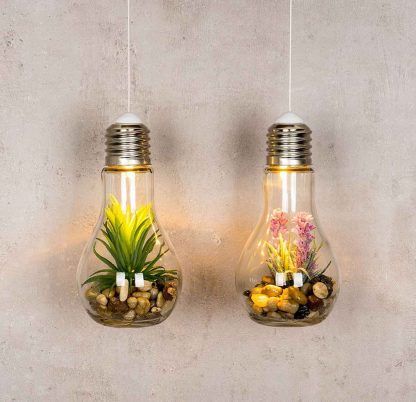 - LED-Glühbirnen aus Glas und Pflanzen aus Kunststoff mit Dekosteinchen