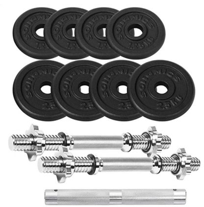 - Dieses Hantel-Set beinhaltet 8 Scheiben (4 x 2,5 kg, 4 x 1,25 kg), was Ihnen ermöglicht, das Gewicht der Hanteln nach Bedarf einzustellen; zudem bestehen diese Hanteln aus robustem Gusseisen mit pulverbeschichteter Oberfläche sowie galvanisierten Stangen und versprechen hierdurch eine lange Gebrauchsdauer