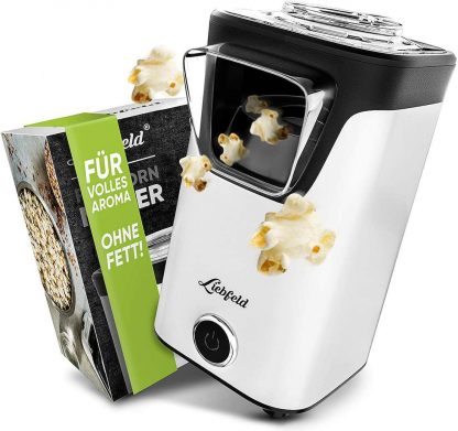 Das Gerät arbeitet mit Heißluft und kommt so im Gegensatz zu Fertig-, Mikrowellen- oder Topfpopcorn ganz ohne Fett oder Öl aus