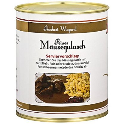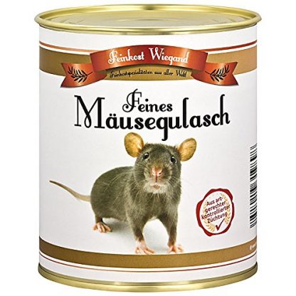 - Der Inhalt wird als Mäusegulasch angeboten. (In Wirklichkeit sind 200 g Süßigkeiten Mäuse in der Dose verpackt)