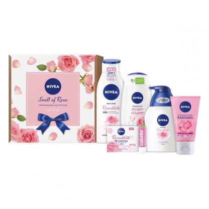 Verwöhnendes Set – Das NIVEA Smell of Roses Geschenkset pflegt die Haut mit Waschgel, Gel-Creme Tagespflege, Pflegeseife, Pflegedusche, Body Lotion und Labello