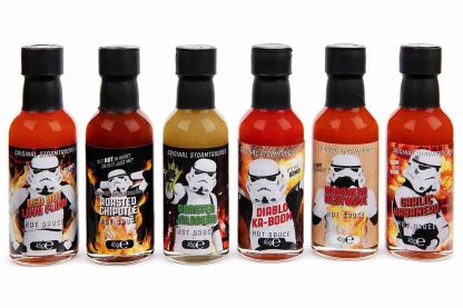 - PROBIERSET: Das Set besteht aus sechs verschiedenen, besonders feurigen scharfen Saucen – Abgefüllt in kleinen Flaschen mit coolen Sturmtruppler-Motiven und Food Truck Verpackung