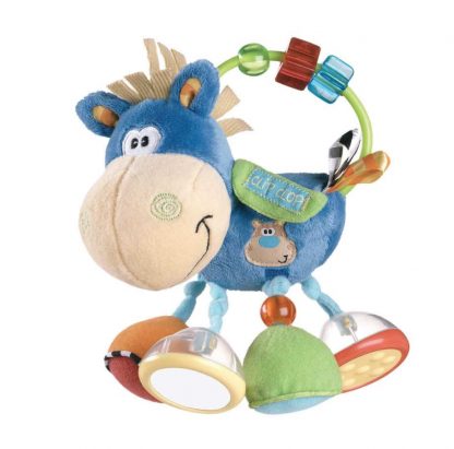 Zahlreiche Spielmöglichkeiten: 4 klappernde Hufe, Integrierter Spiegel, Knisternde und rasselnde Hufe mit Glöckchen und Perlen, Täschchen mit Klett für spannende Entdeckungen