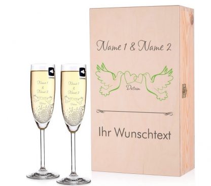 - In der bedruckten Holzkiste befinden sich 2 Hochzeitssektgläser mit Gravur von Leonardo. Diese werden von uns ebenfalls mit dem Motiv der Tauben und den Namen der Brautleute veredelt. Dies geschieht mittels modernster Lasergravurtechnik.