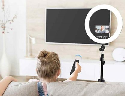 - 18 Zoll Außen,- und 13 Zoll Innendurchmesser, 320 Stück LED-Perlen mit 45W und 5700K, das Selfie-Ringlicht kann in 3 Farbmodi und 11 Helligkeitsstufen eingestellt werden, es bietet verschiedene Beleuchtungsoptionen mit einstellbarer Farbtemperatur, macht den Raum hell und erfüllt Ihre Anforderungen an die Beleuchtung in verschiedenen Situationen. Es gibt drei Telefonhalterungen auf dem Lichtring, so Sie eines beliebigen Modells gleichzeitig benutzen.