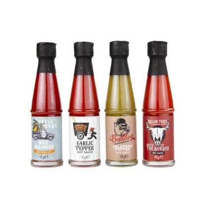 • INHALT: Das Probierpaket beinhaltet 4 kleine Fläschchen mit je 48 g, jedes gefüllt mit einer anderen Hot Sauce. Enthalten sind die Saucen Chinese Noodles Cart Garlic Pepper, Bulldog Burgers Jalapeno Pepper, Killer Ted’s South of the Border und Fresh Farms Mild Habanero