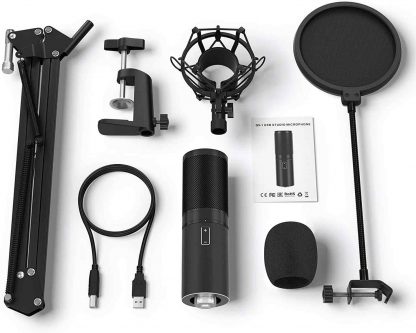 Komplettes Mikrofonset: Das Paket enthält ein Kondensatormikrofon, 1 Metall Mikrofonspinne, 1 verstellbaren Mikrofonarm, 1 Tischhalterung, 1 Popfilter, 1 Mic Foam Cover, 1 1,8m USB A auf B Kabel und 1 Anleitung.