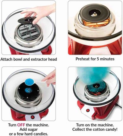 - VIELE GESCHMÄCKE – Mit der Zuckerwattemaschine können Sie verschiedene Geschmacksrichtungen und Farben ausprobieren. Sie können Zucker, Süßigkeiten, Bonbons und Weißzucker probieren, während Sie mit rosa, blauen, gelben Farben experimentieren können, entweder mit oder ohne Aromen oder Geschmäcken.