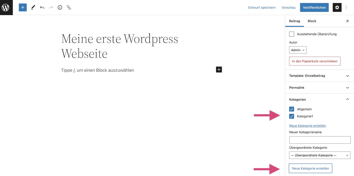 Um deinen Beitrag einer bestimmten Kategorie zuzuordnen gehts du auf der rechten Seite auf Kategorie. Dort kannst du eine neue Kategorie erstellen oder den Beitrag einer Kategorie zuordnen